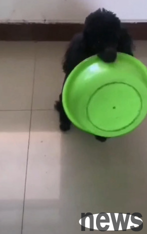 In order to train the dog to be smart, the owner tried his best to let the dog hold the basin, and finally the little dog s expression lit up