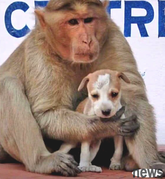 The female monkey hugged the stray dog and raised the dog as a child. Passersby looked forward out of curiosity and burst into tears.