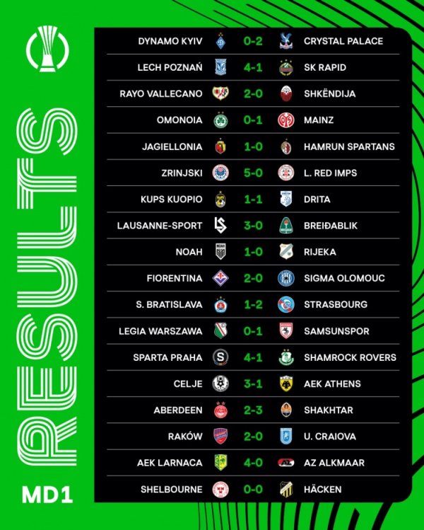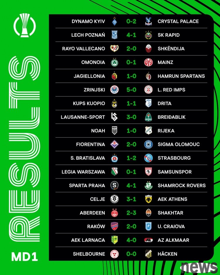 European Union's first round match, Crystal Palace defeated Dynamo Kiev 2-0, Vallecano, Fiorentina and Mainz won, and Alkmare lost 4 goals.