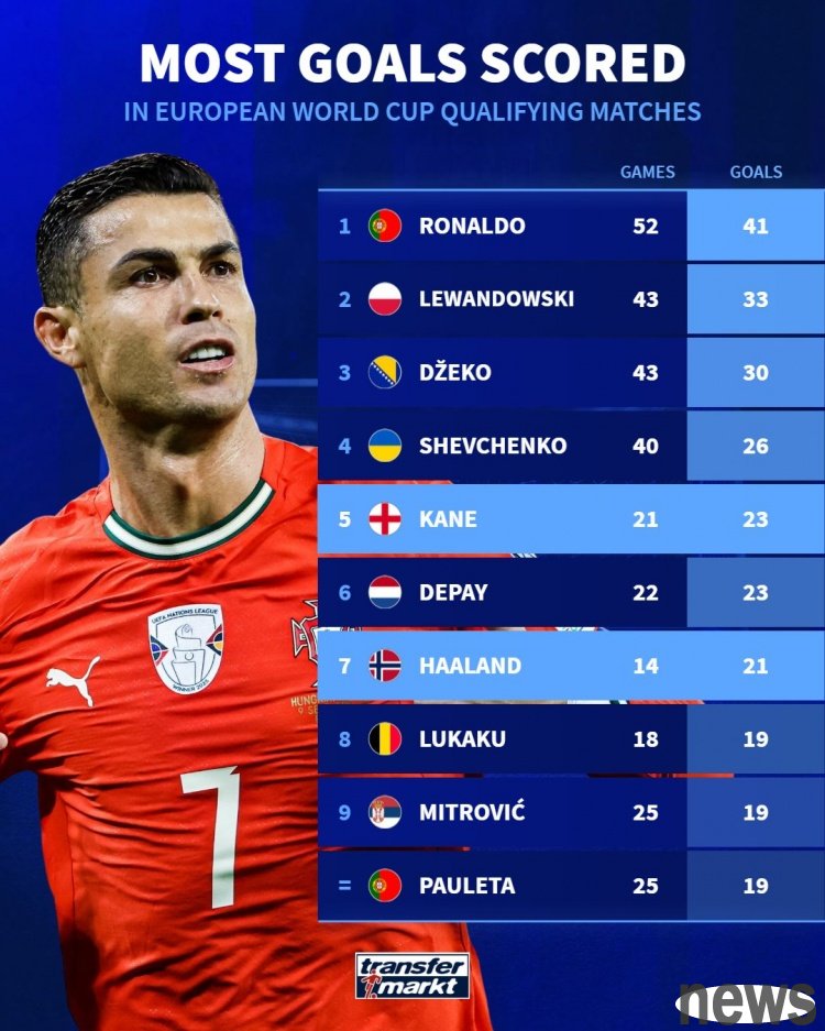 The German transfer market lists the historical scorer list of the European World Cup preliminaries. Cristiano Ronaldo leads the list with 41 goals, Lewandowski is second with 33 goals, and Haaland ranks 7th with 21 goals.