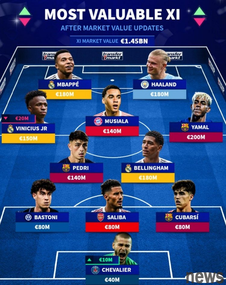 Dezhuan previously updated the value of football players and took stock of the current 11-man lineup with the highest value. The total value is 1.45 billion euros, of which Yamal is the highest at 200 million euros. The specific lineup is as follows: