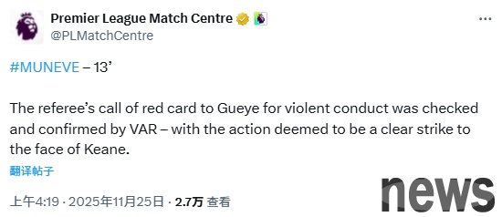 The Premier League official explanation: "The referee determined that Gueye committed a violent act and showed a red card. After VAR technical verification, the action was determined to be an obvious hit to Keane's face."