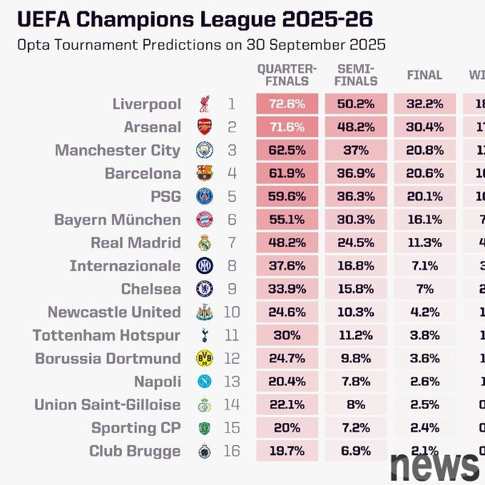 The second round of the Champions League stage is about to start. Opta Supercomputer updated the probability of winning the Champions League, with Liverpool at the top, and Arsenal and Manchester City ranked second and third respectively.