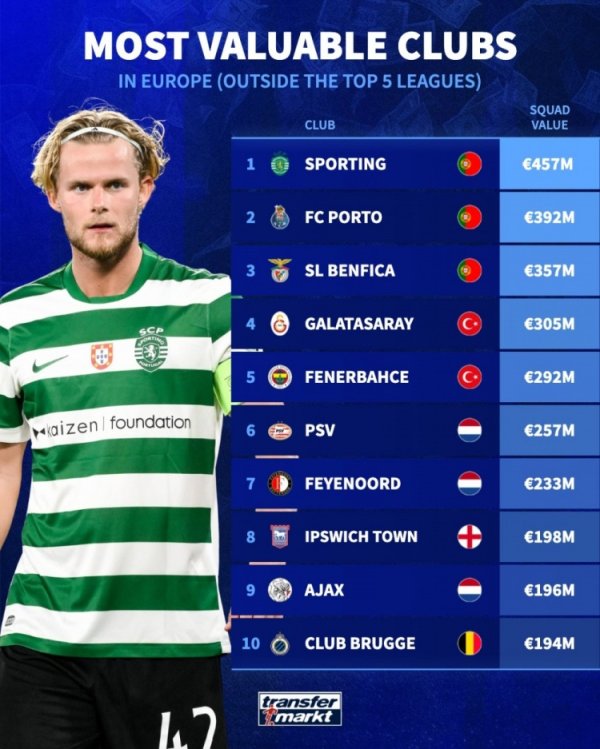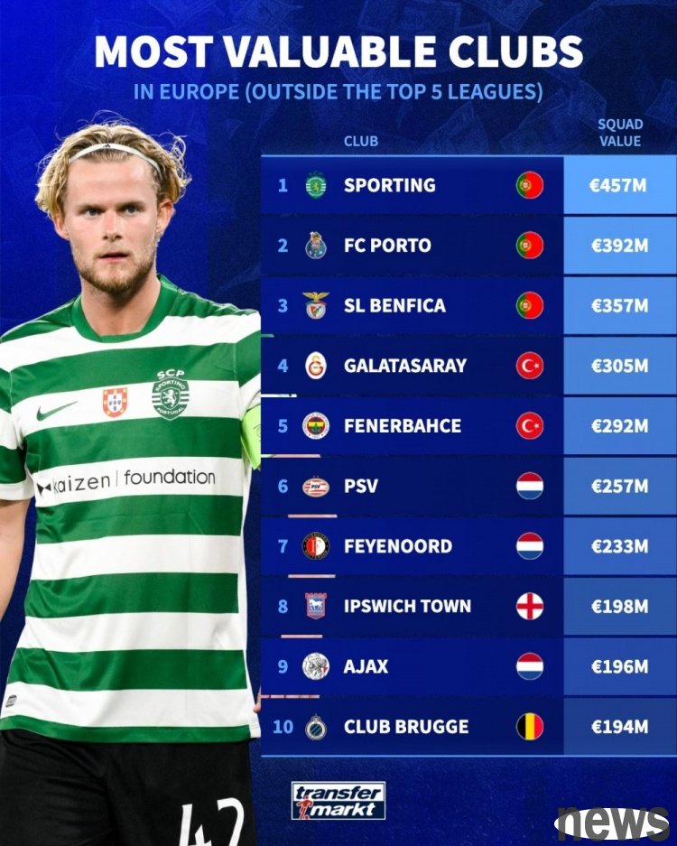 The German transfer market has taken stock of the value of European teams outside the five major leagues, and Sporting CP ranks first with 457 million euros.