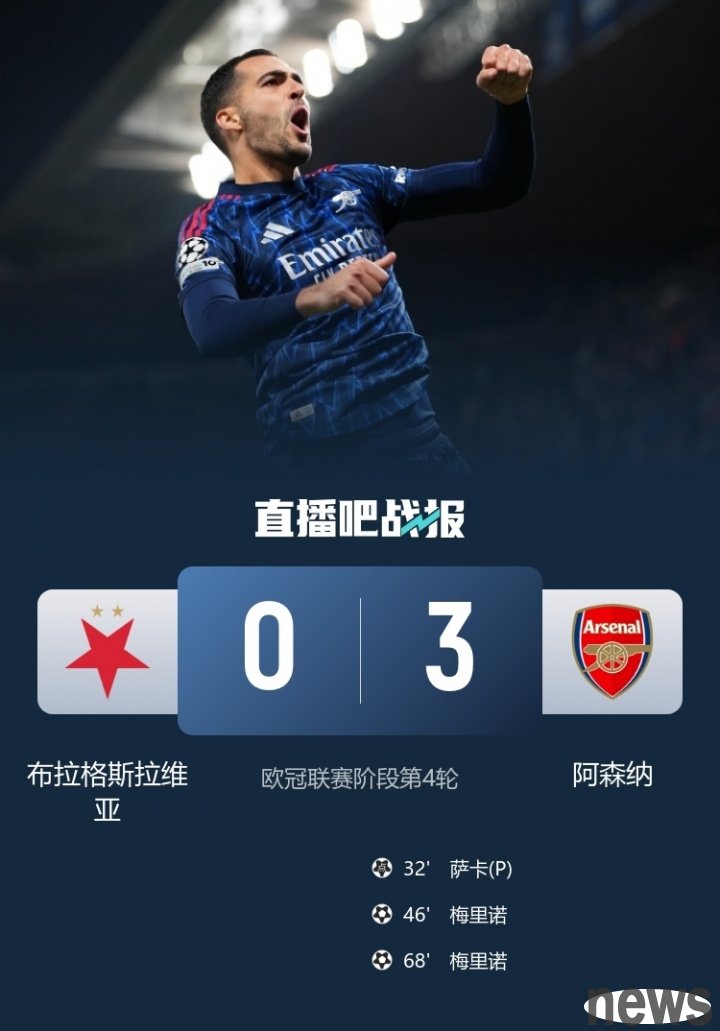 In the fourth round of the Champions League, Arsenal 3-0 Slavia Prague away from home, winning all four rounds of the Champions League!