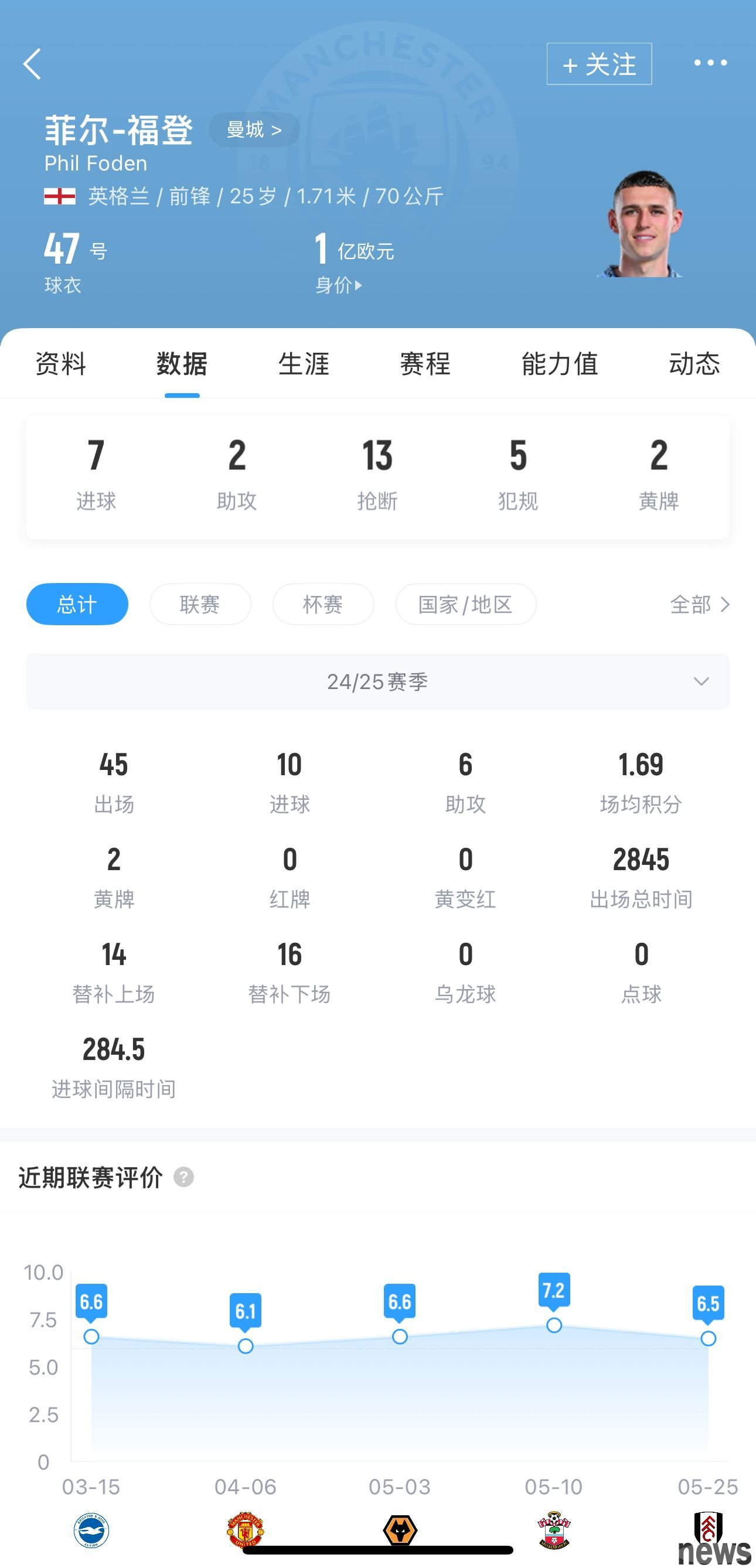 This season, Foden played 45 times for Manchester City, achieving 10 goals and 6 assists, including 7 goals and 2 assists in 28 Premier League games and 3 goals and 2 assists in 9 Champions League games. In the early and later stages of the season, Foden suffered a long-term goal drought. He is currently experiencing a four-month drought. His last goal was on January 26.