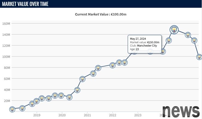 In the 24/25 season, Foden's value experienced three consecutive declines, falling 10 million euros on December 16, 2024, falling another 10 million euros on March 18, 2025, and plummeted by 30 million euros on May 30, 2025, falling 50 million euros within half a year, and now only 100 million euros are left.