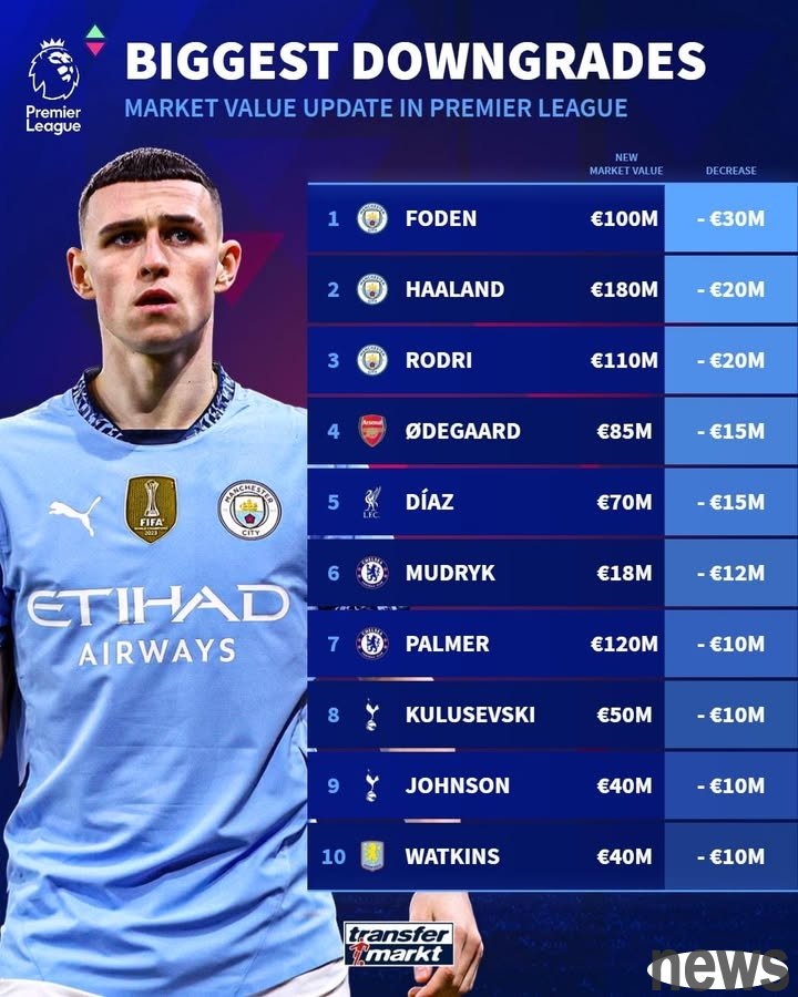 Yesterday, the Premier League updated its value, and Foden's value plummeted by 30 million euros, making it the player with the largest decline in this period's value update.