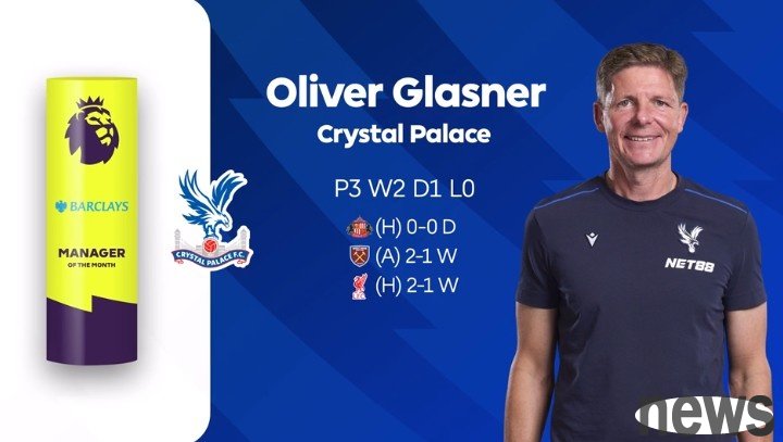 Austrian coach Oliver Glasner led Crystal Palace to remain undefeated in September and was elected as the Premier League Coach of the Month, winning this award for the first time in his career.